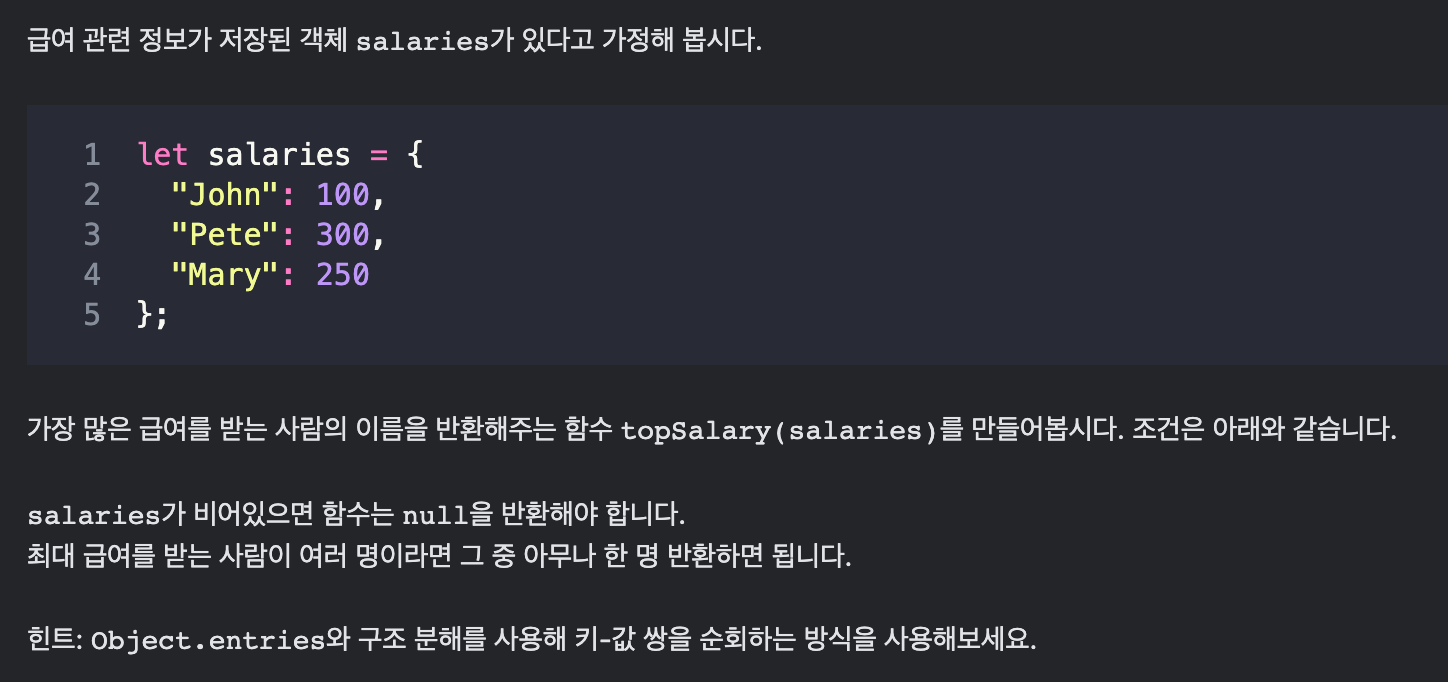 | [Javascript] 모던 JS 5.9 (Object.keys, values, entries) 과제 (0) | 2022.06.26 |