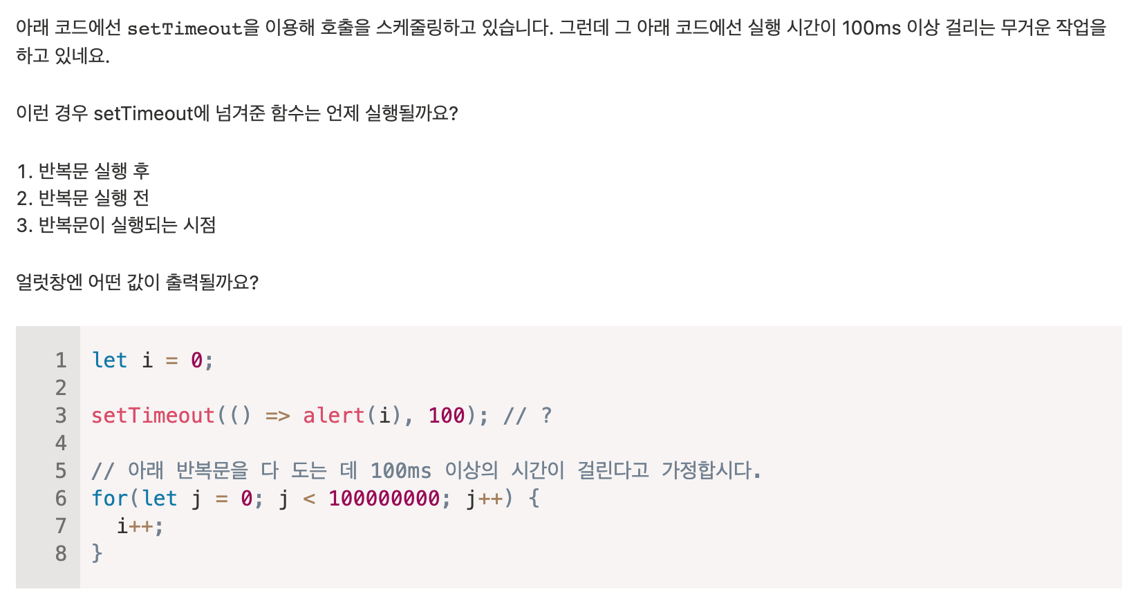 2) setTimeout은 무엇을 보여줄까요?