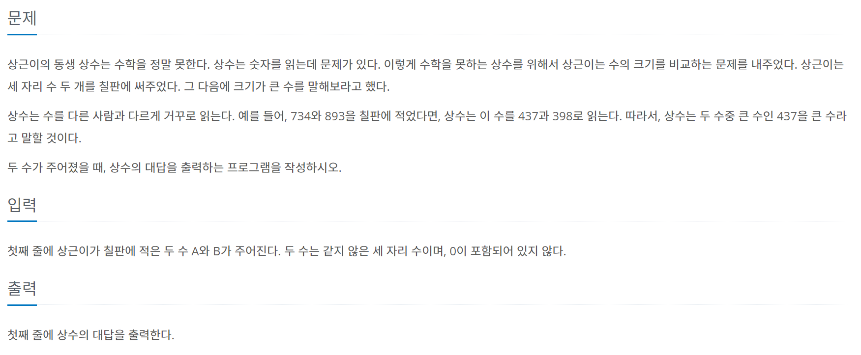상근이의 동생 상수는 수학을 정말 못한다. 상수는 숫자를 읽는데 문제가 있다. 이렇게 수학을 못하는 상수를 위해서 상근이는 수의 크기를 비교하는 문제를 내주었다. 상근이는 세 자리 수 두