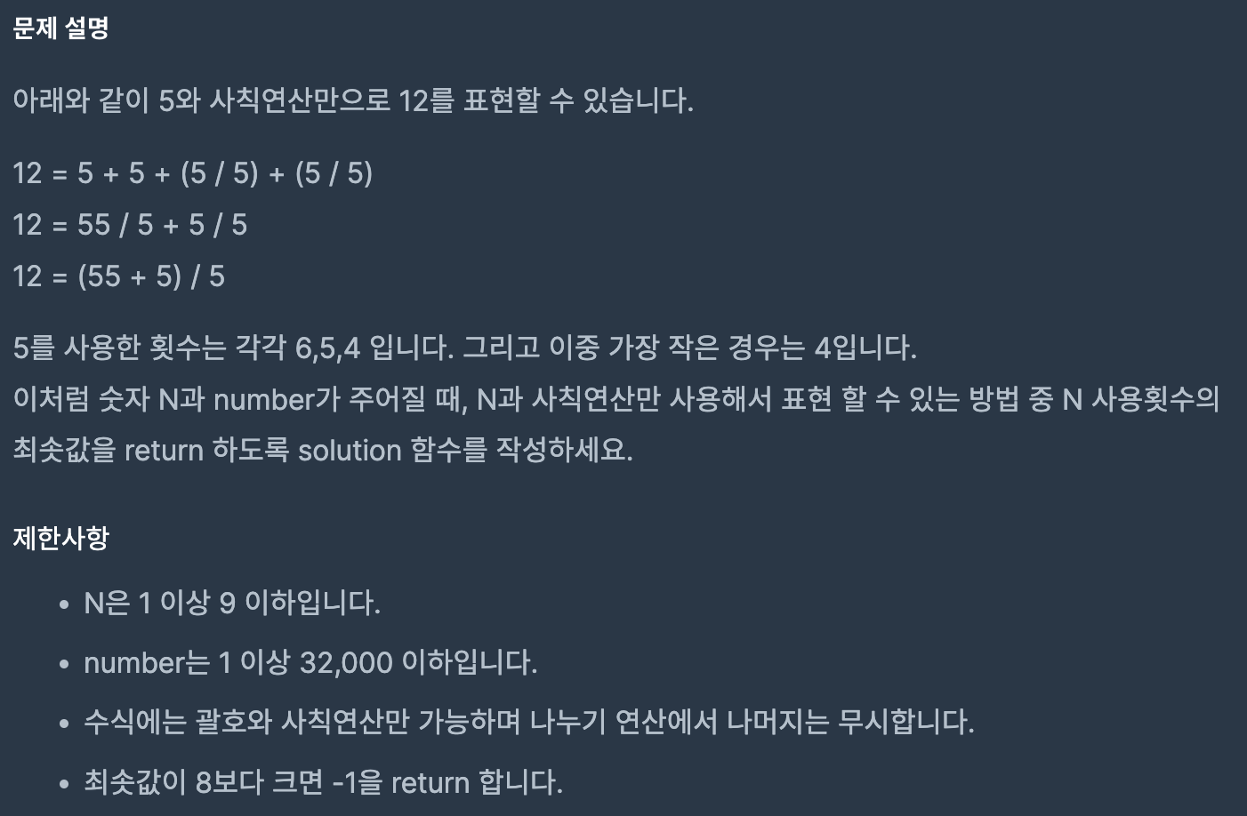 숫자 N과 number가 주어질 때, N과 사칙연산만 사용해서 표현 할 수 있는 방법 중 N 사용횟수의 최솟값을 return 하는 solution