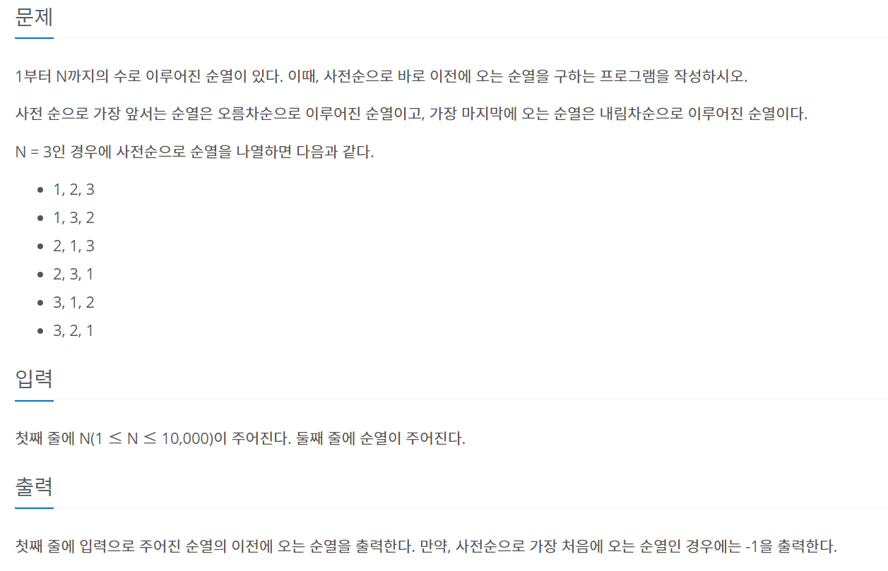 입력한 순열이 사전 순으로 가장 처음에 오는 순열이면 -1을 출력했다.