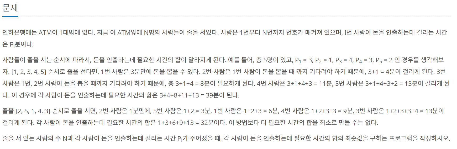 돈을 인출하는데 필요한 시간의 합의 최솟값을 구하려면