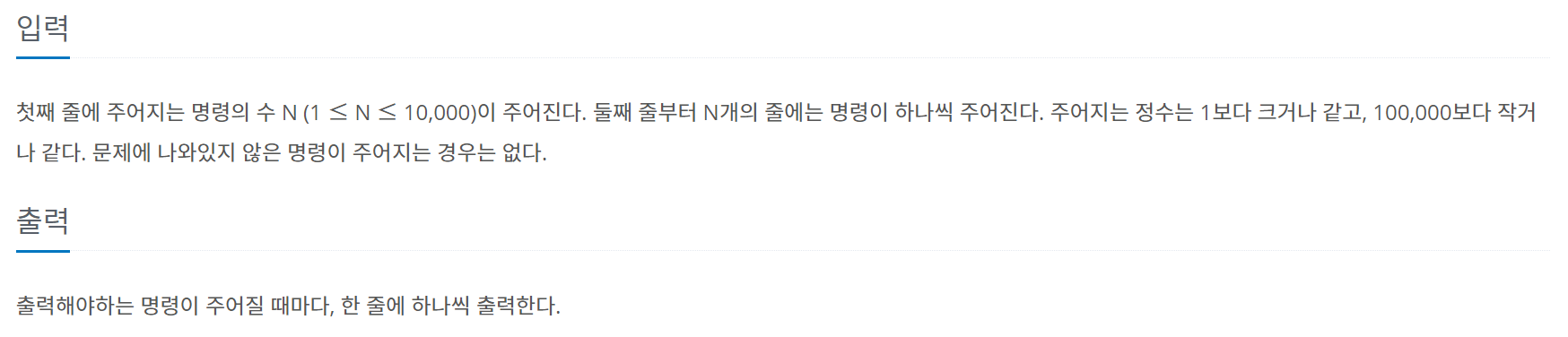 첫째 줄에 주어지는 명령의 수 N (1 ≤ N ≤ 10,000)이 주어진다. 둘째 줄부터 N개의 줄에는 명령이 하나씩 주어진다. 주어지는 정수는 1보다 크거나 같고, 100,000보다 작거나 같다. 문제에 나와있지